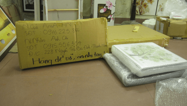 - Gửi hàng đi tất cả các tỉnh thành trong cả nước. Các tỉnh gần có thể gửi qua nhà xe, đây là hình thức được chúng tôi ưu tiên áp dụng vì chi phi vận chuyển hợp lý, và hình thức gửi hàng qua bưu điện. Tranh được gói cẩn thận bằng 3 lớp bảo vệ, một lớp giấy Lynon bên trong tránh nước, có chèn xốp, và lớp vỏ hộp caton bên ngoài nên rất an tâm khi vận chuyển.
